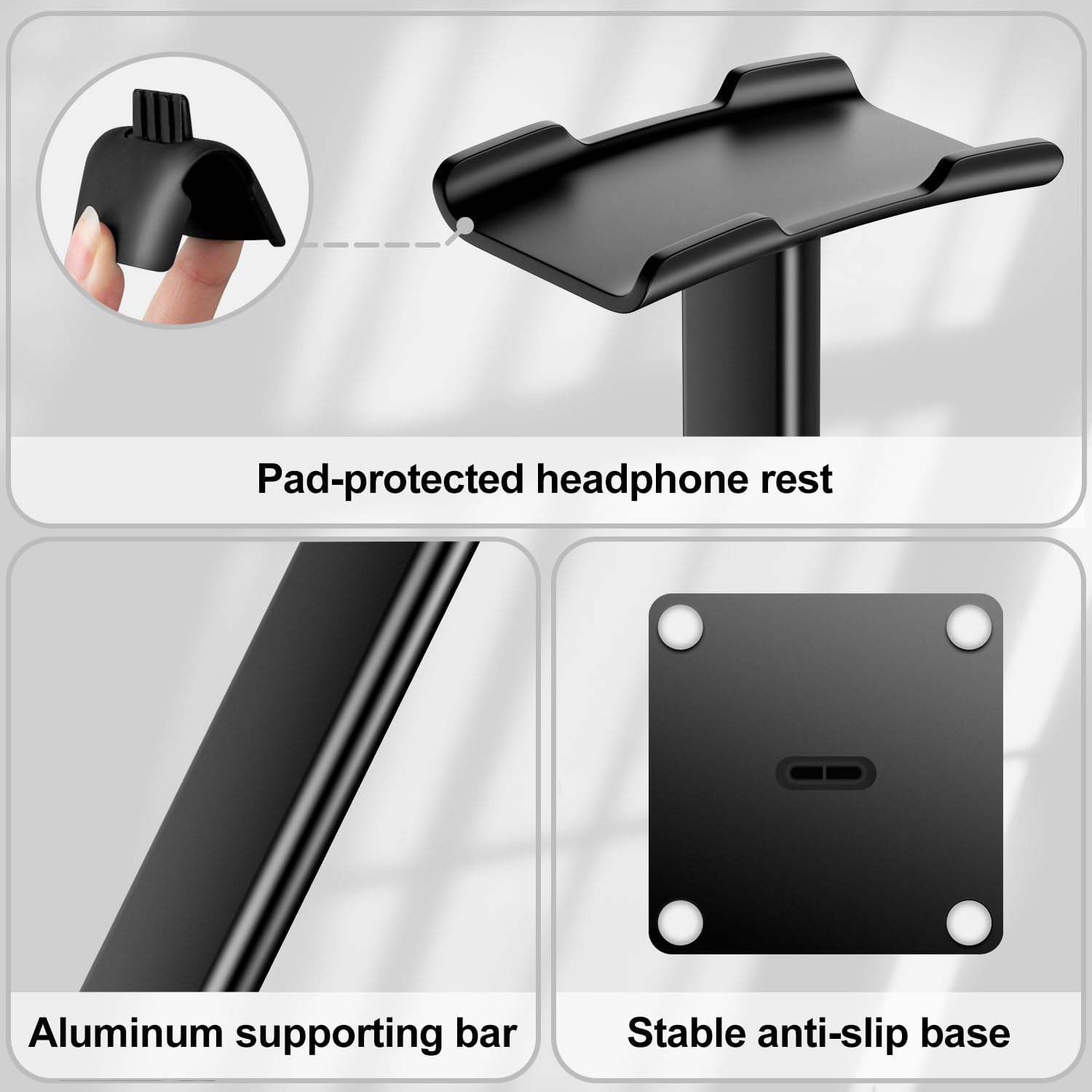 - Stabil und sicher: Die Mittelstange aus Aluminiumlegierung ist robust und schlank; Gummi-Stabilisatoren unter der Unterseite greifen die Oberfläche und halten den ganzen Ständer sicher sitzt, während Sie Ihre Kopfhörer halten; weiches und schützendes Gummi an der Oberseite verhindert Kratzer oder Schäden mit seiner Dämpfung. Hochwertiges ABS- und TPU-Gummimaterial, sicher und langlebig.